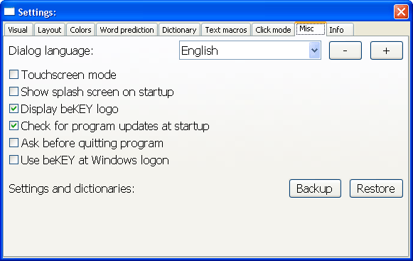 Here you can backup and restore beKEY settings and dictionaries. This can be used to backup your personal settings or to transfer them to another computer. Both actions require beKEY to get restarted.